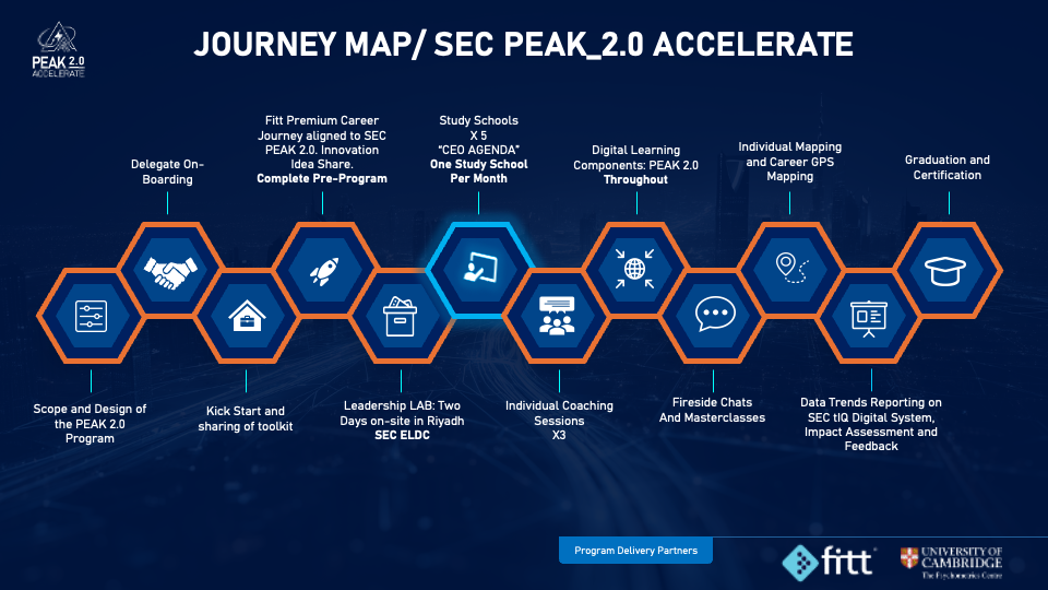 On behalf of the entire fitt team, as well as the University of Cambridge, it gives us great pleasure to welcome you to the Saudi Electricity Company PEAK Journey. Firstly, we recognize that your nomination to PEAK is a clear affirmation of your significant contribution to the company as a senior leader. Congratulations with this. We also realize that you have been greatly successful in your career thus far, and this is confirmed through your nomination. Our job is to create a unique experience that can support you in A) contributing to the SEC growth strategy into the future and B) building your leadership brand, reflecting, and chartering your path forward. It is our privilege to have you on board.
